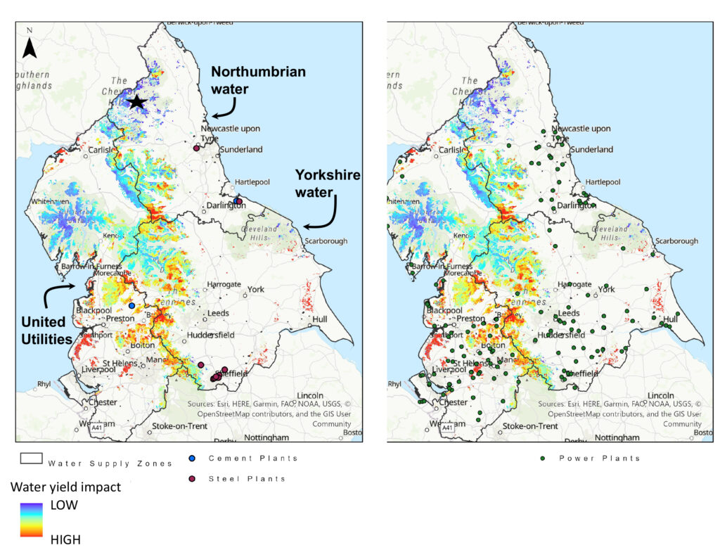The impact of peatland degradation on water yield varies between locations. The maps show that any peatland degradation will have the highest impact in the catchments of Yorkshire Water as well as Southern parts of United Utilities and the industries associated with those. Based on industry footprint, the operations of power plants near Liverpool will be most affected. Industries near Newcastle will be least impacted. For example, Newcastle draw their water from the Kielder reservoir, as annotated by a star. According to the modelling, this is one of the less impacted reservoirs compared to the Southern reservoirs. While steel plants in the Sheffield area seem far removed from potential water stress areas, they may still be reliant on surface water or supplied water from waterways and reservoirs that source water from peatland catchments. There are many industry and asset specific complexities that need to be taken into account when analysing and quantifying nature-related risks, but it is obvious that geospatial datasets will play a key role.